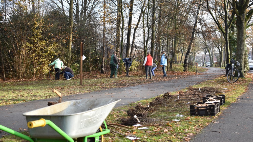 Am Samstag, den 5. Dezember, welcher auch zufällig Tag des Ehrenamts war, pflanzte die Lokale Agenda heimische Gehölze und Sträucher im Moddenbachtal in Harsewinkel. Auf der ehemaligen Blühwiese griffen zahlreiche Mitglieder und Unterstützer der Lokalen Agenda Umwelt unter der Regie von Landschaftsgärtner Georg Ries zwischen Friedhof und Spielplatz ehrenamtlich zur Schaufel und setzten bei strahlendem Sonnenschein rund 50 Sträucher.