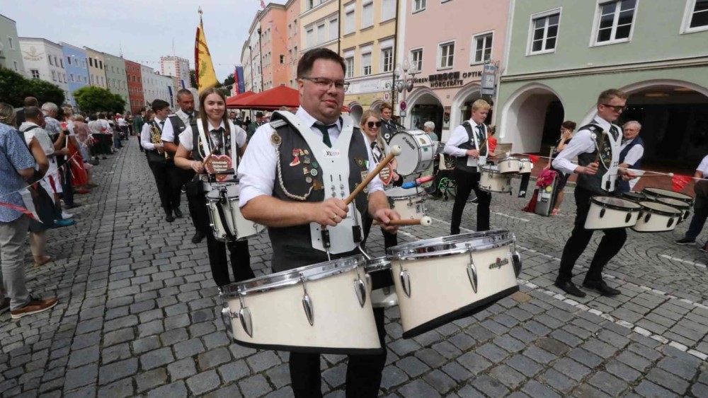 Der Sonntag begann mit dem feierlichen Empfang am Rathaus in Mühldorf am Inn durch Bürgermeister Michael Hetzl. In seiner Ansprache erinnerte General a.D. Bernhard Hanhart an die Anfänge der Freundschaft. Gemeinsam mit Gisela Wenner überreichte er ein Gastgeschenk an den Trachtenverein. Die Harsewinkeler Delegation war tief bewegt vom Gegengeschenk der Mühldorfer: ein Ehrenfahnenband, das im Rahmen des 250-jährigen Jubiläums der St.-Nikolauskirche geweiht wurde, sowie ein Krug und ein Pin des diesjährigen Schützen- und Trachtenumzuges. Im Anschluss lud die Stadt zu Brezeln und Getränken ins Rathaus ein, begleitet von einer musikalischen Einlage des Trommlercorps.