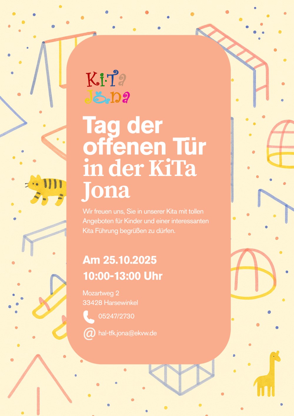Am Samstag, den 25. Oktober 2025, lädt unsere ev. Kita Jona von 10:00 bis 13:00 Uhr herzlich zum Tag der offenen Tür ein. Alle Interessierten – Familien, Nachbarn und Freunde – sind herzlich willkommen, unsere Einrichtung kennenzulernen.