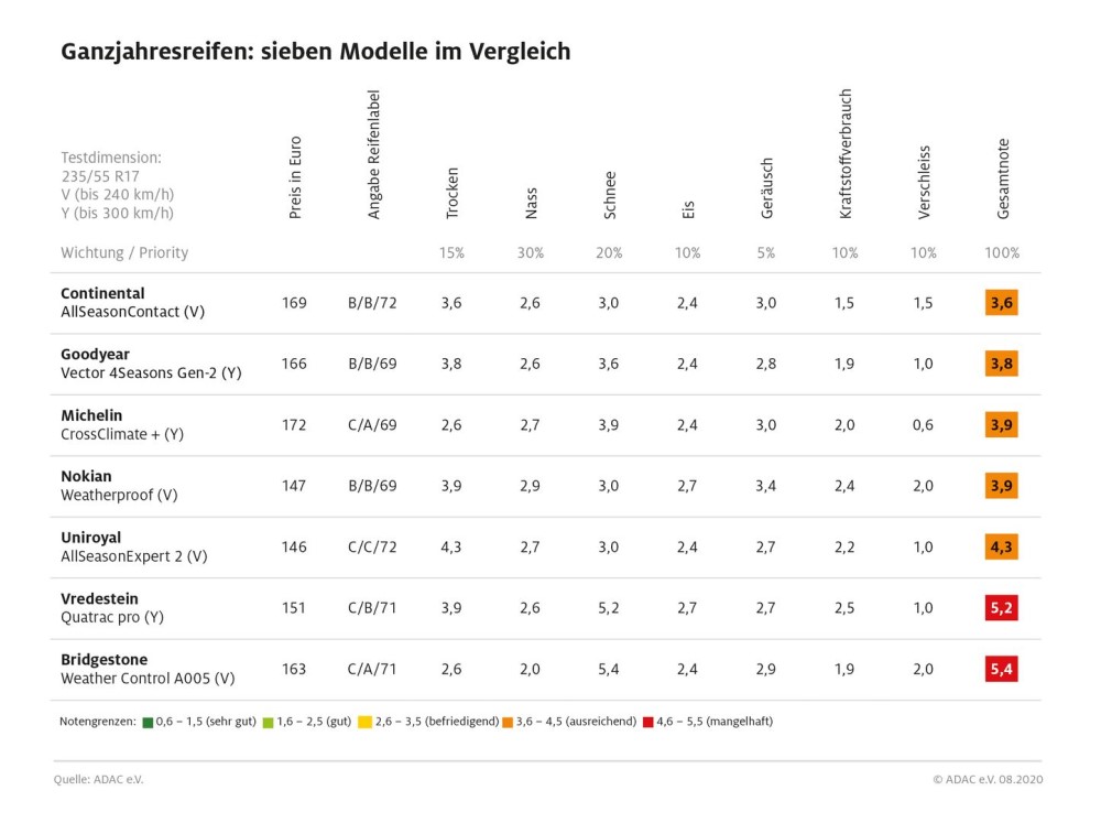 Das Ergebnis zeigt: Ganzjahresreifen sind immer nur ein Kompromiss. Kein getesteter Ganzjahresreifen kann sich ernsthaft mit einem guten Winterreifen auf Schnee bzw. einem guten Sommerspezialisten auf trockener Fahrbahn messen. Für Autofahrer jedoch, die in einer Region mit seltenem Schneefall leben oder ihr Auto im Zweifel auch mal stehen lassen können, sind Ganzjahresreifen eine wirtschaftliche Alternative zu den klassischen Sommer- bzw. Winterreifen.