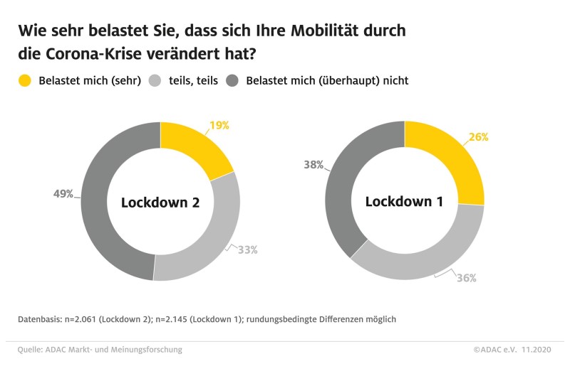 Auch während des zweiten Lockdowns, der wegen der Corona-Pandemie in Deutschland im November verhängt wurde, sind die Auswirkungen auf die Mobilität spürbar. Sie fallen aber deutlich geringer aus als während des ersten Lockdowns im Frühjahr. Das sind die Erkenntnisse einer zweiten Umfrage zur individuellen Mobilität in der Corona-Krise, die der ADAC im November durchgeführt hat. Dabei wurden 2061 Personen ab 18 Jahren befragt. Die Ergebnisse der Befragung zur Mobilität in der ersten Lockdownphase hatte der Club im April dieses Jahres vorgestellt.