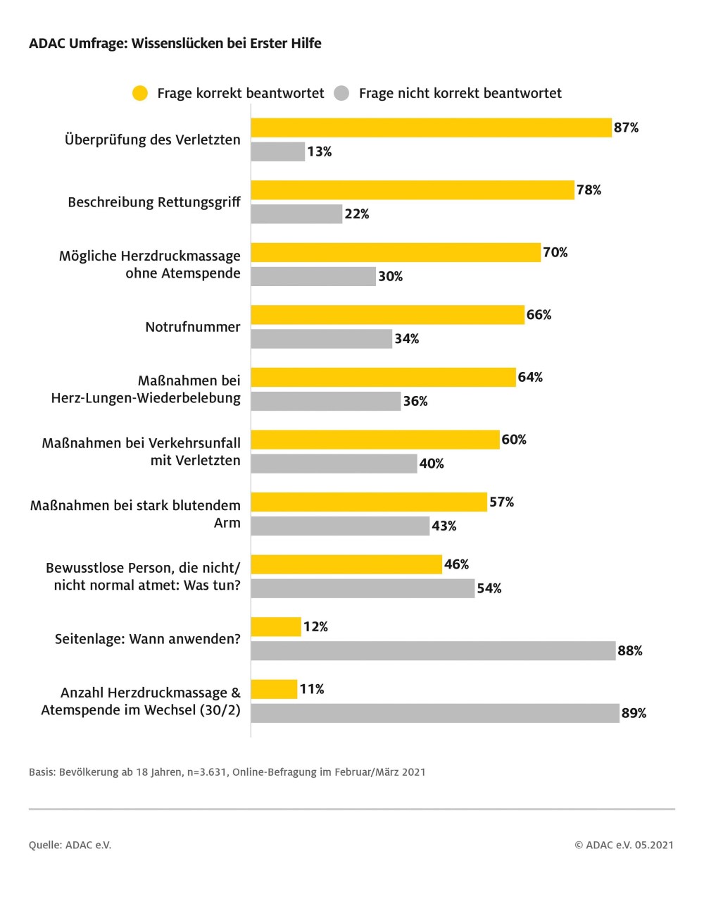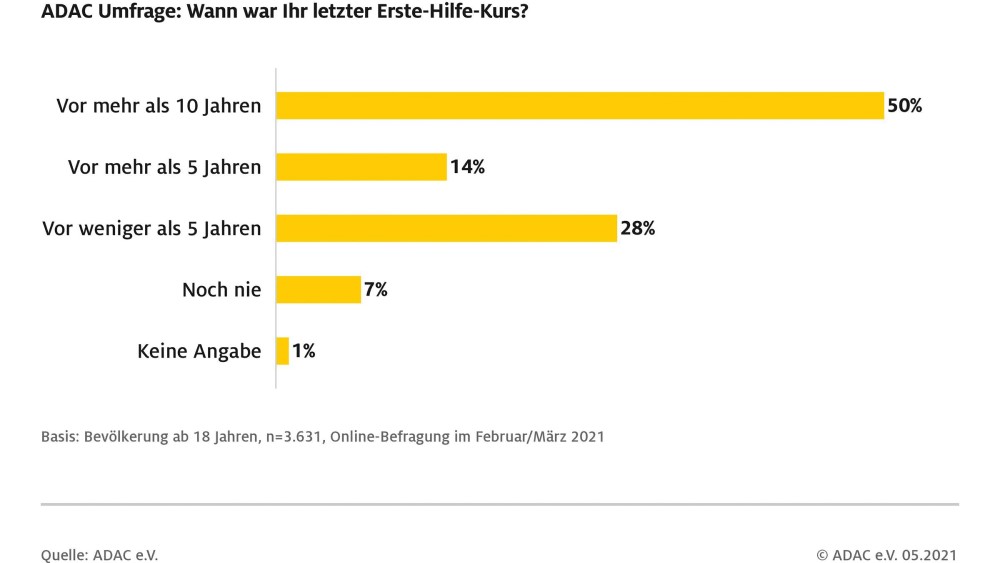 Im Rahmen einer aktuellen Online-Umfrage hat der ADAC rund 3600 Personen aus allen Bundesländern zu ihren Kenntnissen in Erster Hilfe befragt. Dabei zeigte sich, dass nur 55 Prozent der Befragten mit ihren Antworten richtig lagen. Allerdings wäre eine Mehrheit der Deutschen (52 Prozent) im Notfall dazu bereit, Erste Hilfe zu leisten. Ein Viertel ist sich nicht sicher und ein weiteres Viertel glaubt, zu Erster Hilfe nicht in der Lage zu sein. Die Hälfte der Befragten gab an, dass sie ihren letzten Kurs vor zehn oder mehr Jahren absolviert hätte. Fast alle Befragten (86 Prozent) würden im Notfall die 112 oder 110 wählen, um Hilfe zu holen. Die richtige und europaweit einheitliche Notrufnummer 112 kennen 66 Prozent.