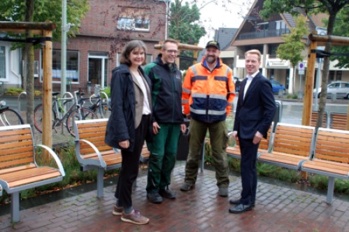 Die Bänke, die vorher hier standen, und denen man ihr Alter ansah, sind einer modernen über Eck gebauten Sitzgruppe gewichen; anstelle der Baumhaseln, denen der verdichtete Untergrund das Wurzel- und damit auch das Höhenwachstum erschwerte, stehen hier jetzt neben einer Zierkirsche zwei Zierbirnen, deren Blattwerk sich zukünftig dachartig entwickeln und so die auf den Bänken Sitzenden gleichermaßen vor Hitze und Regen schützen soll. Der Boden wurde vor der Pflanzung vom Bauhof ausgetauscht, so dass sich die Wurzeln der neu gepflanzten Bäume jetzt gut entwickeln können. Bürgermeisterin Sabine Amsbeck-Dopheide weist darauf hin, dass bei der Auswahl der Pflanzen für den rund 20 Quadratmeter großen Platz die Insektenfreundlichkeit im Vordergrund stand. Sowohl die Gehölze als auch die dazwischen gesetzten blühenden Stauden und Kräuter – gepflanzt wurden unter anderem Sonnenhut, Fette Henne, Thymian und Salbei – werden von Biene, Schmetterling und Co gerne angeflogen. „Insektenfreundlichkeit steht überall dort, wo es um städtische Neuanpflanzungen geht, ganz klar im Vordergrund. Dass sich mit diesen Pflanzen urbane Orte von einer sehr guten Aufenthaltsqulität gestalten lassen, kann man hier sehen“, freut sich die Bürgermeisterin.