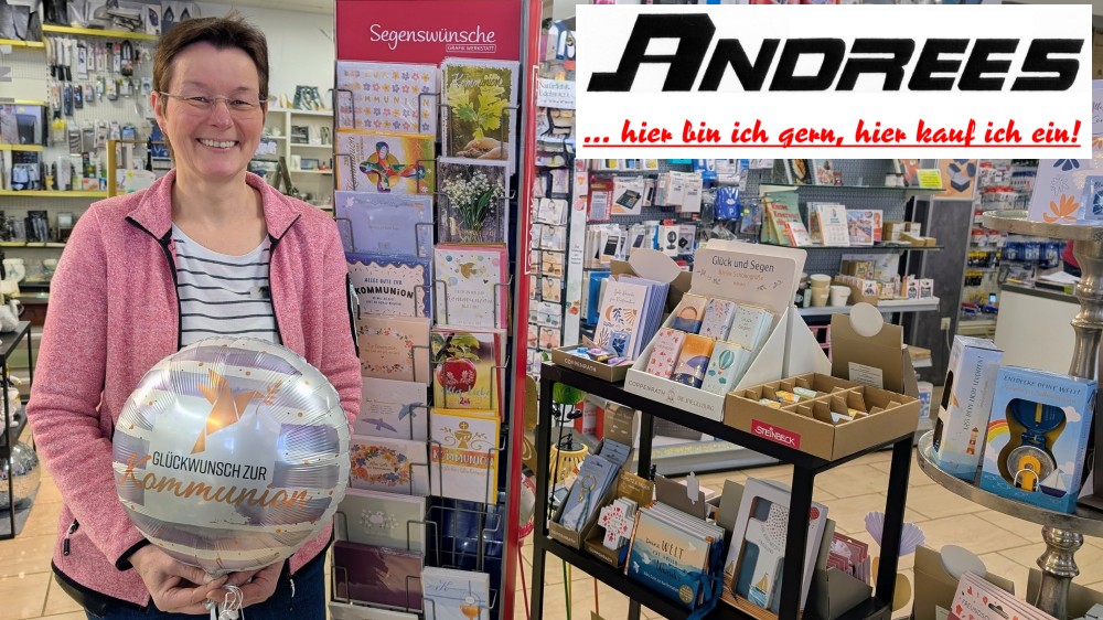 Selbstverständlich findest Du bei Andrees in diesem Frühjahr wieder alles rund um die Themen Kommunion und Konfirmation. Neben Glückwunschkarten, verschiedenen Kerzen, Kreuzen und vielen weiteren Geschenkideen findest Du bei Andrees auch die perfekte Fest-Dekoration für diesen besonderen Tag. Als ganz besonderes Highlight bereiten wir ein Gotteslob mit individueller handschriftlicher oder gedruckter Widmung vor und auf Wunsch werden natürlich auch alle Geschenke festlich von uns verpackt.