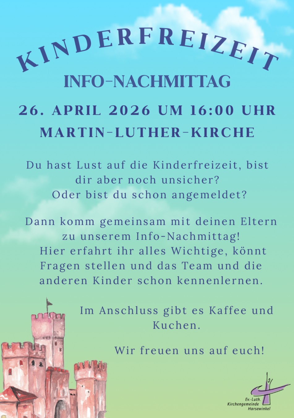 Die ev. Kirchengemeinde Harsewinkel lädt alle Kinder im Alter von 8 bis 12 Jahren und ihre Familien herzlich zu einem Info-Nachmittag rund um die kommende Kinderfreizeit ein.