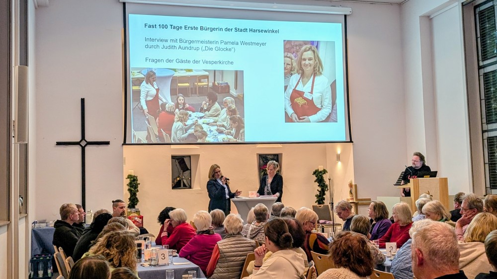 Auch die dritte Ausgabe der Vesperkirche Harsewinkel war ein sozial-diakonisches Angebot und darum war auch jeder willkommen! Nach dem Essen folgte ein je ca. 30-minütiges Kurzprogramm. So boten die „Barber Angels“ ihre Dienste an, das „Manuel-Feuss-Duo“ spielte bekannte Coverlieder unplugged, Bürgermeisterin Pamela Westmeyer sprach mit Glocke-Redakteurin Judith Aundrup über ihre ersten (fast) 100 Tage im Amt und auch der „NGL-Chor“ unter der Leitung von Winfried Klasmann trat auf. Außerdem wurde die Arbeit von Sebastian Plath beim „Mittagstisch in Halle“ präsentiert und bei der Aktion „Vesperkirche singt“ waren alle Gäste zum fröhlichen Mitsingen eingeladen. Den Abschluss am 24. Januar feierte man musikalisch mit dem Posaunenchor Harsewinkel.