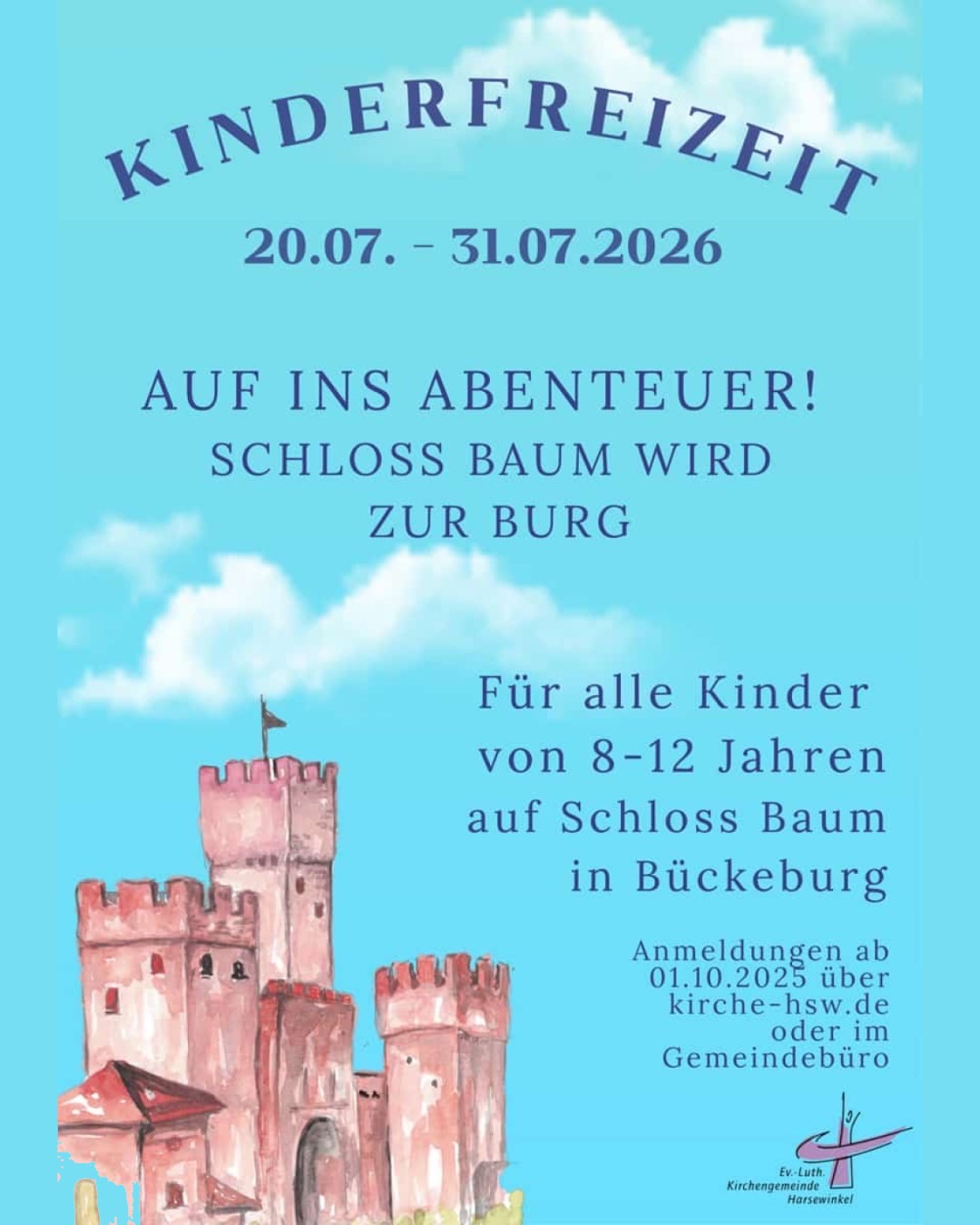 Auch im Sommer 2026 bietet die Evangelische Kirchengemeinde Harsewinkel wieder eine Kinderfreizeit an. Vom 20. bis 31. Juli 2026 geht es für Kinder im Alter von 8 bis 12 Jahren nach Bückeburg. Die Teilnehmenden erwartet ein abwechslungsreiches Programm mit Spielen, Kreativangeboten, Ausflügen und spannenden Erlebnissen in der Natur.