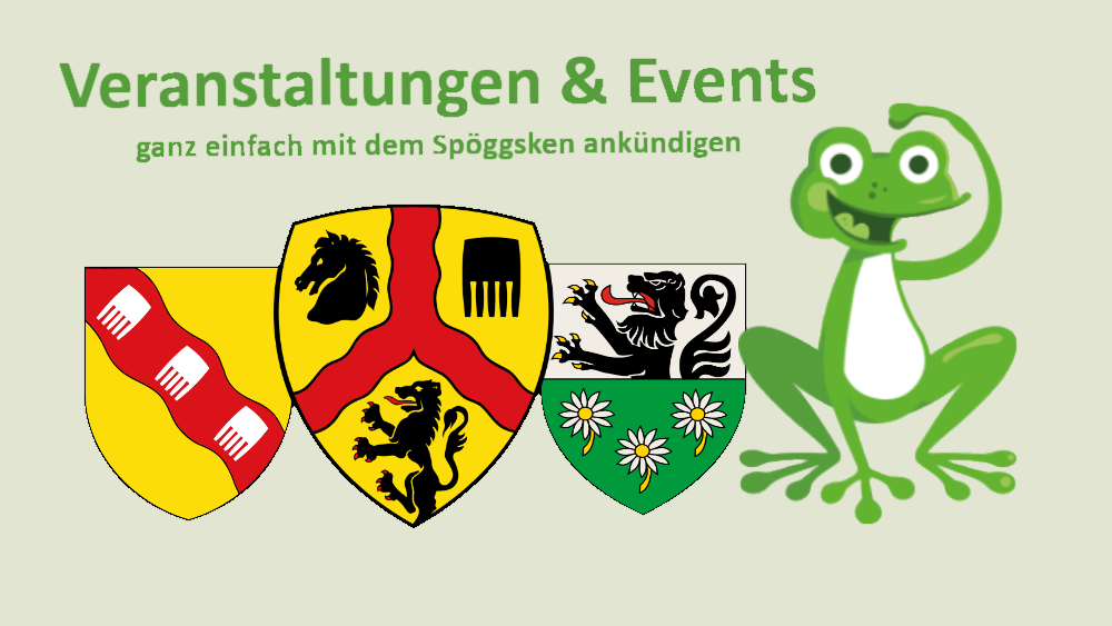 Das Spöggsken benötigt für die Ankündigung per Beitrag einen Text oder zumindest aussagekräftige Stichpunkte inklusive aller relvanten Informationen zum Event (DOC, PDF oder einfach per E-Mail-Text) sowie eine Grafik, ein Logo oder ein Foto zum Thema (Dateiformate JPG, GIF oder PDF) im Querformat. Mindestens eine Grafik muss im Format 16:9 vorliegen oder in dieses Format gebracht werden können. Für die Veröffentlichung in den sozialen Medien können gerne auch zusätzlich Grafiken etc. in den gängigen Formaten mitgeliefert werden.