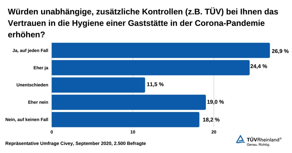 Wie wichtig das breit angelegte Programm von TÜV Rheinland ist, zeigen aktuelle Verbraucherbefragungen: Eine repräsentative Befragung des Berliner Meinungsforschungsinstituts Civey vom August 2020 zeigt, dass 55 Prozent aller Menschen aufgrund der Corona-Pandemie im Alltag in jedem Fall stärker auf Hygiene achten, weitere 28 Prozent tun dies eher. Eine ergänzende repräsentative Umfrage zur Hygiene in Gaststätten vom September 2020 zeigt: 51,3 Prozent der Befragten geben an, dass unabhängige und zusätzliche Kontrollen beispielsweise durch den TÜV das Vertrauen in die Hygiene einer Gaststätte in jedem Fall oder eher erhöhen. Hierzu habe die Markforscherinnen von Civey bevölkerungsrepräsentativ 2.500 Menschen befragt.