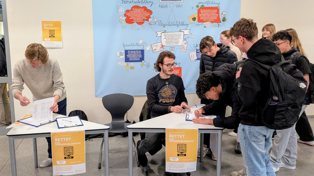 „Mit der Petition ,,Rettet das Jugendparlament“, welche seit Anfang dieser Woche läuft, möchten wir zeigen, dass das Interesse vieler Jugendlicher an einem Jugendparlament weiterhin vorhanden ist. Wir sammeln Unterschriften, indem wir durch die Klassen gehen, in den Pausen mit den Jugendlichen ins Gespräch kommen und durch Plakate und Posts in Social Media für die Petition werben.