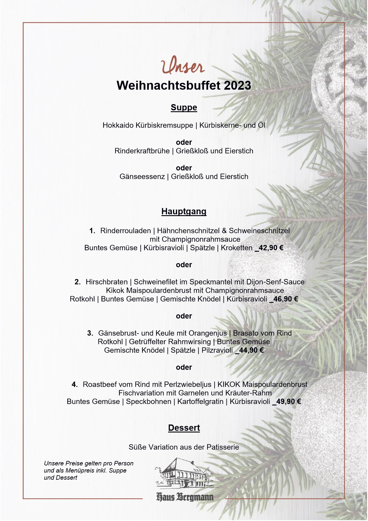 Mit drei verschiedenen Suppen und vier verschiedenen Hauptgängen ist bestimmt auch Ihr Favorit für die Weihnachtsfeiertage dabei und eine süße Variation aus der Patisserie rundet den festlichen Gaumenschmaus ab. Von Rinderrouladen und Hähnchenschnitzeln über Hirschbraten und Weihnachtsgans bis Schweinefilet und Roastbeef ist alles dabei.