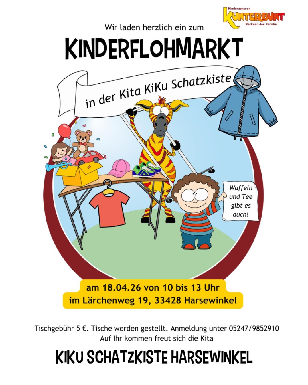 Die Kita Kiku Schatzkiste (ehemals Tapferes Schneiderlein) in Harsewinkel lädt am Samstag, den 18. April von 10:00 Uhr bis 13:00 Uhr, zum Flohmarkt „Rund um’s Kind“ in den Lärchenweg ein. Mit Kaffee, Tee und Waffeln wird für eine kleine Stärkung zwischen den Stöbereinheiten gesorgt.