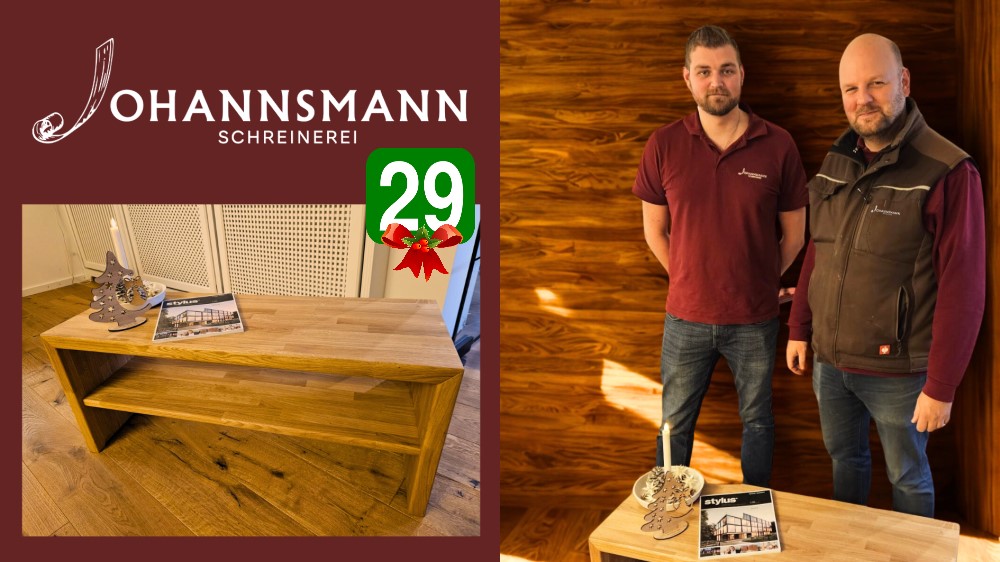 Am heutigen 29. Dezember kannst Du mit der Schreinerei Johannsmann gemütlich Platz nehmen, denn hinter dem neunundzwanzigsten von insgesamt 31 „Kläppchen“ des Advents- & Silvesterkalenders verbirgt sich eine Sitzbank aus Eiche (Maße: 1 m lang, 40 cm tief und 45 cm hoch).
