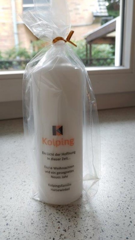 Da wir im Laufe des Jahres fast alle geplanten Veranstaltungen absagen mussten und auch als Zeichen der Verbundenheit mit unseren Kolpingschwestern und / -Brüdern, haben wir uns für eine eigens entwickelte Kolpingkerze entschieden. Sie soll uns in dieser Zeit der Pandemie begleiten – ein Licht sein – auch in der Adventszeit, zu Weihnachten und im neuen Jahr.