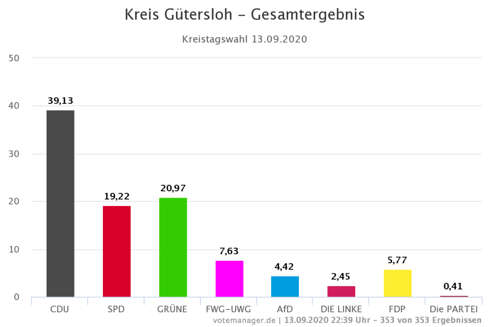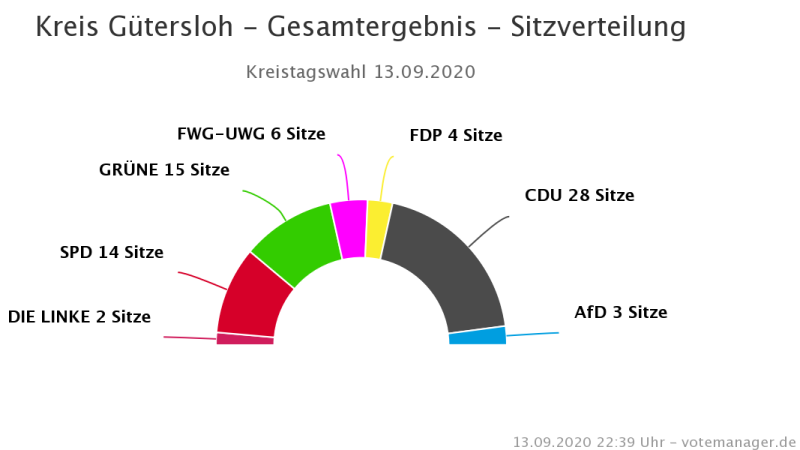 Alle Ergebnisse im Detail inklusive der Gewinne und Verluste, der gewählten Direktkandidaten für den Kreistag sowie die Ergebnisse der Kommunalwahlen im Kreis Gütersloh finden sich im Internet auf den Seiten des Votemanagers der regio it (www.kreis-guetersloh.de oder https://wahlen.votemanager.de/).