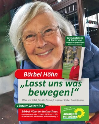 Wer Bärbel Höhn persönlich treffen möchte, darf sich auf einen spannenden Abend im Heimathaus Harsewinkel freuen. Die Veranstaltung ist eine Kooperation mit dem Ortsverband der Grünen in Harsewinkel und wird von Juan Carlos Palmier gesponsert. Der Eintritt ist frei. In der Regel stellt Bärbel Höhn ein Sparschwein für den Verein „Faire Welt“ für Projekte in Afrika auf. Jeder ist herzlich willkommen.