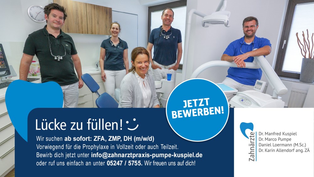 Bewirb dich jetzt unter info@zahnarztpraxis-pumpe-kuspiel.de oder ruf an unter 05247 / 5755.