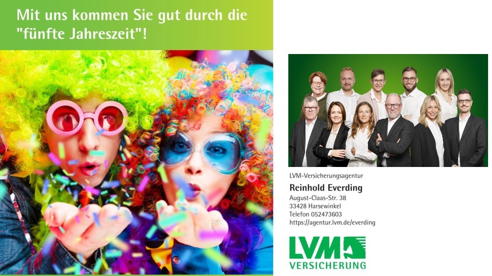Ob ein Missgeschick im Gedränge, ein kleiner Unfall beim Feiern oder ein Schaden am Eigentum – mit den passenden Versicherungen der LVM-Agentur Reinhold Everding sind Sie bestens geschützt. Als Ihre LVM-Agentur vor Ort stehen wir Ihnen zuverlässig zur Seite und kümmern uns darum, dass Sie Karneval sorgenfrei genießen können.