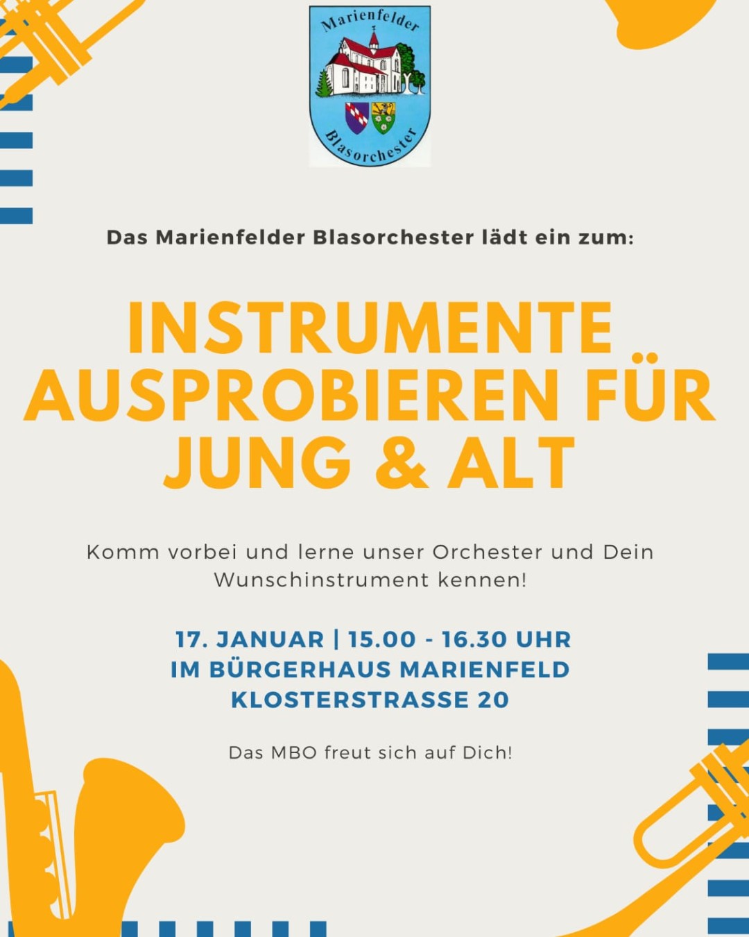 Das Marienfelder Blasorchester lädt Interessierte aus allen Altersklassen am Samstag den 17.01. ab 15 Uhr im Bürgerhaus Marienfeld (Klosterstraße 20) dazu ein, die Instrumente eines Blasorchesters kennenzulernen und selbst auszuprobieren. Eine Anmeldung ist nicht erforderlich. Das Angebot richtet sich explizit nicht nur an Kinder und Jugendliche, auch Erwachsene sind herzlich willkommen.