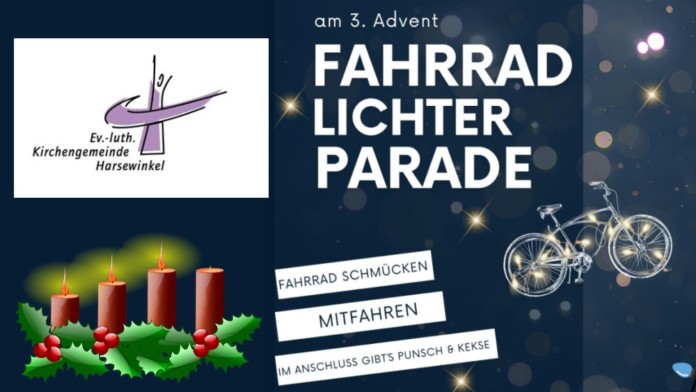 Nach gelungenem Auftrakt im vergangenen Jahr startet am 3. Advent, 15.12.2024, um 17 Uhr wieder die Fahrradlichterparade in Harsewinkel. Start ist der Parkplatz neben der Martin-Luther-Kirche in Harsewinkel, Clarholzer Str. 23. Die Teilnahme ist generationsübergreifend an alle gerichtet, ob groß oder klein, alt oder jung. Die Teilnehmenden werden aufgefordert, ihre Fahrräder adventlich herzurichten mit Lichterketten, Christbaumschmuck, Tannenbäumen, Lametta, LEDs, alles was blinkt und glänzt. Der Aufruf lautet: „Macht eure Räder startklar, schmückt sie mit Lichtern und schließt euch unserer Fahrradlichterparade an! Gemeinsam bringen wir die Stadt zum Leuchten!“