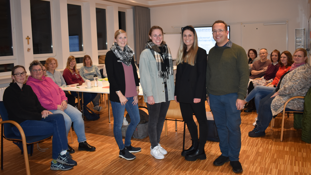 Julia Grahl (Abteilung Jugend, Kreis Gütersloh), Mariella Bockholt (Caritasverband Kreis Gütersloh e.V.), Lisa-Marie Ewers (Caritasverband Kreis Gütersloh e.V.), und Referent Marco Lehmann (v. l.) gemeinsam mit den Teilnehmenden der Fortbildung ‚Das Schutzkonzept in der Kindertagespflege‘ (© Kreis GT).
