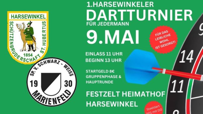 Die Dartsabteilung von SW Marienfeld und die St. Hubertus-Schützen-Bruderschaft Harsewinkel laden gemeinsam zum ersten Harsewinkeler Dartturnier für jedermann ins Festzelt auf dem Heimathof ein! Das Turnier startet am 9. Mai gegen 13 Uhr. Einlass ist bereits ab 11 Uhr damit schon frühzeitig für gute Stimmung gesorgt werden kann.