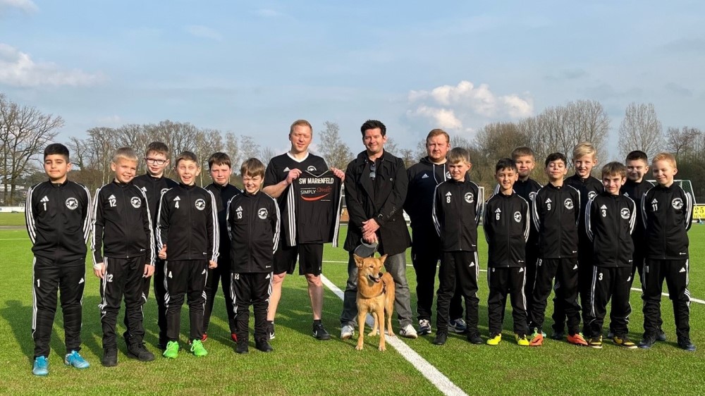 Die E3-Jugend von Schwarz-Weiß Marienfeld freut sich über ein neues einheitliches Outfit. Der Zahnarztpraxis Simply Smile aus Harsewinkel hat Trainingsanzüge in den Vereinsfarben an die 10 bis 12-jährigen Nachwuchsfußballer gespendet. Zur Übergabe der neuen Ausrüstung hat Praxisinhaber Daniel Loermann „Soon-Hui“ mitgebracht. Der koreanische Jindo-Hund war bei den Spielern natürlich sehr beliebt. Trainerteam Juri Ognew und André Vogelpohl sowie die Spieler bedankten sich für die Unterstützung.