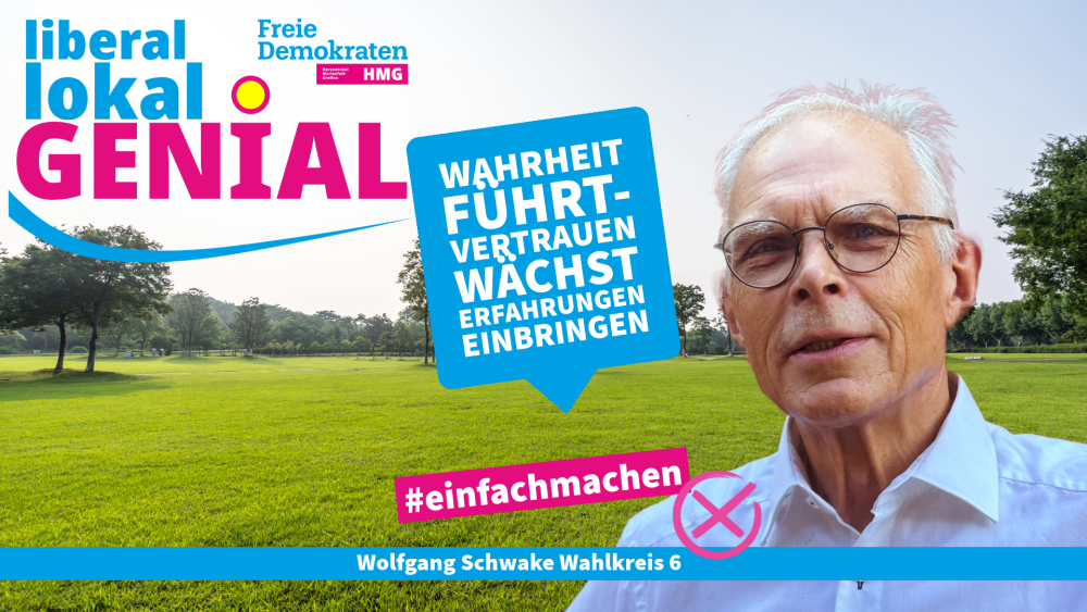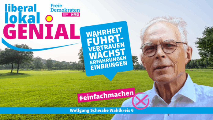 Wolfgang Schwake – 77 – Berater / Projektentwickler – seit 1976 parteipolitisch als verantwortlicher Bürger tätig. Motto: Nicht nur meckern, selbst anpacken. Seit 1997 Stadtdirektor und ab 1999 hauptamtl. Bürgermeister einer „Großen Mittelstadt“ in NRW.