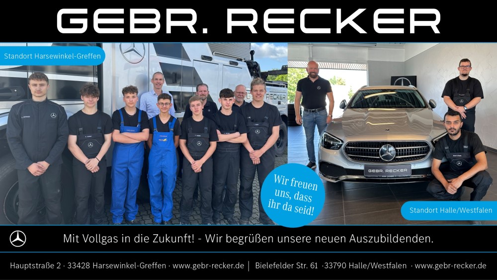 Zum Ausbildungsstart 2025 heißen wir bei der Gebr. Recker GmbH neun neue Auszubildende herzlich willkommen! An unseren Standorten in Harsewinkel-Greffen und Halle/Westfalen starten sie in ihre Ausbildung als Kfz-Mechatronikerin für Pkw und Nutzfahrzeugeund Fahrzeugbaumechaniker.