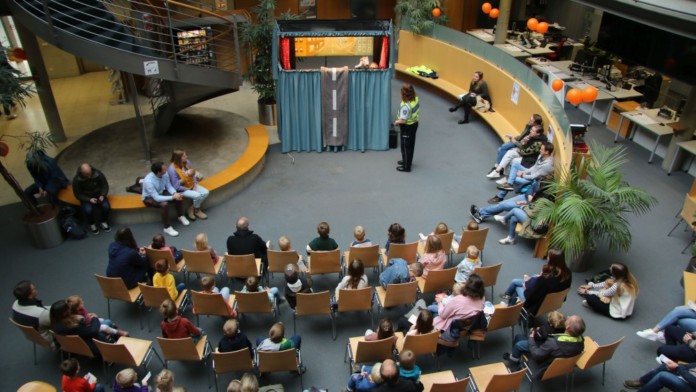 Wo normalerweise zum Beispiel Anträge für Führerscheine oder Nummernschilder bearbeitet werden, sorgten am Maustag die Vorstellungen des Puppentheaters der Kreispolizei für Begeisterung. Mit Handpuppen wurde das Thema Verkehrssicherheit spielerisch für rund 150 Kinder in drei Vorstellungen vermittelt – Mitten im Straßenverkehrsamt. Und das besondere an dem Stück: Auch die Maus kam darin vor.