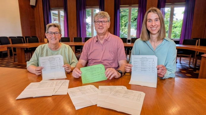 (V. l.) Silvia Letsch, Fachkoordinatorin des städtischen Bürgerbüros, Michael Bergholz und Nadja Brinzing vom städtischen Wahlamt bereiten die Kommunalwahl am 14. September vor.