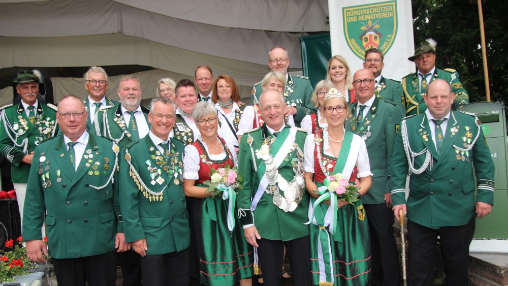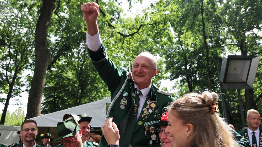 Bei dem spannenden Schießen um die Königswürde am Vatertag der Schützen konnte Klaus Thiemann den treffsicheren Schuss erzielen und das spannende Schießen mit dem 108. Schuss für sich gewinnen. An seiner Seite ist seine Königin Karin Thiemann, welche ihren Mann direkt mit einem strahlenden Lächeln in den Arm nahm. Unser neuer König ist 64 Jahre alt, wohlverdienter Rentner und war über 48 Jahre über die Claas Fertigungstechnik bei der Firma Aumann tätig. Heute bereist er zusammen mit seiner Frau Karin verschiedene Länder oder beradelt die umliegenden Städte und Kommunen. Außerdem ist er in der CDU Harsewinkel mit großem Einsatz tätig. Das neue Throngefolge setzt sich zusammen aus Markus und Katja Scharmann, Thorsten und Marion Duibmann, Volker und Lisa Kozlik, Georg und Karin Baumewerd, Günter und Karin Brinkrolf, Markus Hatzfeld und Corinna Thiemann sowie Ralf Grothues und Nicole Romeira. Die beiden Adjutanten sind Burkhard Vogelpohl und Markus Söte.