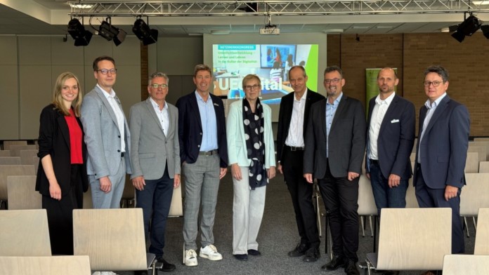 Die Kooperationspartner des Projekts ‚Schule und digitale Bildung‘ (v.l.): Stephanie Schlüter (Zentrum für Bildung und Chancen), Thomas Becker (Kreis Gütersloh), Klaus Twelsiek (Bezirksregierung Detmold), Dr. Norbert Kreutzmann (Kreis Gütersloh), Dr. Iris Hohberg (Bezirksregierung), Christoph Mohn (Reinhard-Mohn-Stiftung), Christian Ebel (Bertelsmann-Stiftung), Arne Hasken (Kreis Gütersloh) und Achim Wörmann (Ems-Berufskolleg) (Foto: Kreis Gütersloh).