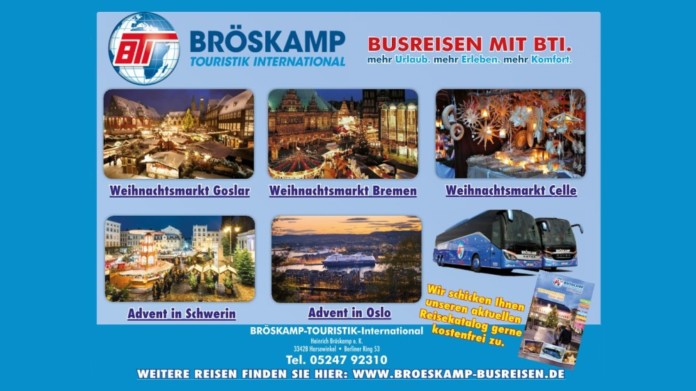 Unser Winterreisekatalog 2025/2026 ist ab sofort verfügbar! Tauchen Sie ein in die faszinierende Welt des Winters und finden Sie mit Bröskamp-Touristik-International Ihr persönliches Highlight – ob Adventsmarkt, Weihnachts- oder Silvesterreisen. Lassen Sie sich von außergewöhnlichen Reiseideen begeistern und finden Sie Ihre Winter-, Festtags- oder auch Frühlingsreise.
