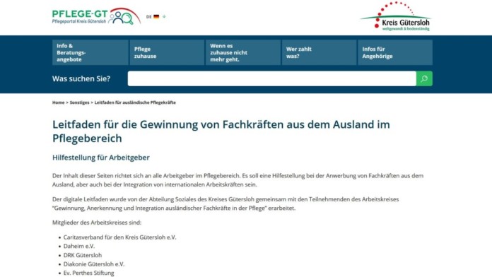 In dem digitalen Leitfaden sind Informationen rund um die Arbeit in der Pflege und die Gewinnung von Fachkräften aus dem Ausland gesammelt (Screenshot: Kreis Gütersloh).