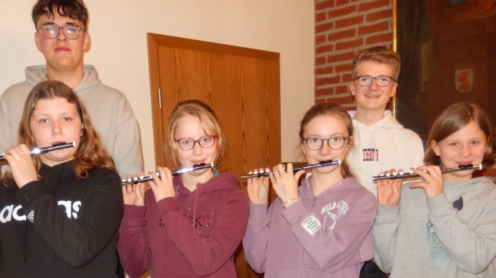 Das Foto zeigt (v.l.n.r.) die Flötistinnen Lea Marie, Klara, Amelie und Maria sowie in der zweiten Reihe Ausbilder Lars Muckhoff und Trommler Hannes Bartsch (Foto: ÖSK).