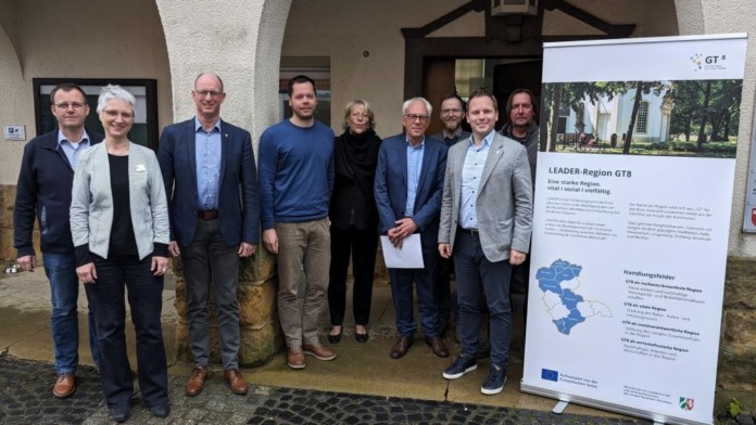 Die Mitglieder der Lokalen Aktionsgruppe der LEADER-Region ‚GT8‘ (v. l.): Andreas Westermeyer, Birgit Kaupmann, Thomas Tappe, Christoph Dammann, Susanne Mittag, Dr. Rolf Westheider, Boris Voß, Michael Meyer-Hermann und Bernhard Walter. Foto: Alexander Jaegers/LEADER-Regionalmanagement (Foto: Referat Presse – Kreis Gütersloh).