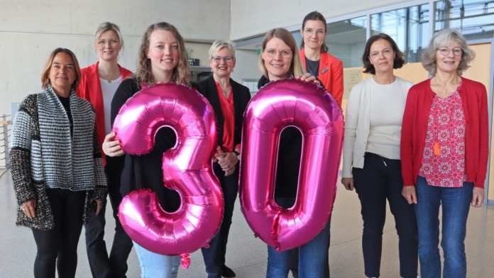 Feiern das 30-jährige Bestehen der Arbeitsgemeinschaft: (v.l.) Barbara Fleiter (Schloß Holte-Stukenbrock), Marina Schomburg (Harsewinkel), Nora Breuer (Werther), Inge Trame (Gütersloh), Sandra Werner (Halle), Angela Wüllner (Kreis Gütersloh), Sabine Heethey (Verl) und Bettina Ruks (Steinhagen) (Foto: Kreis Gütersloh).