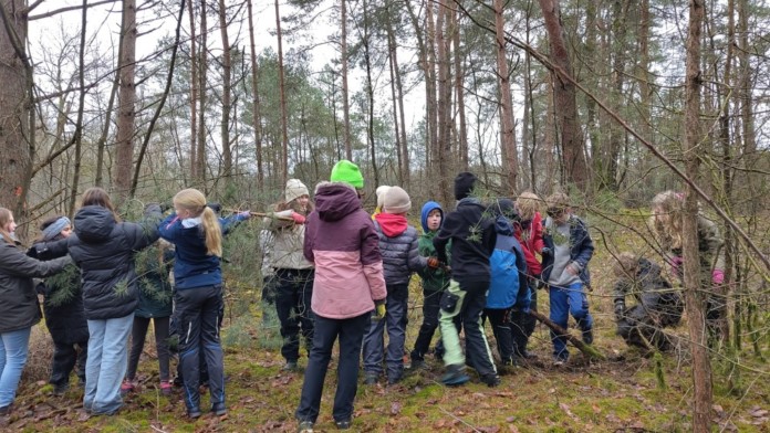 Zusammen entfernen die Schülerinnen und Schüler junge Waldkiefern und Exemplare der invasiven Spätblühenden Traubenkirsche (Foto: Kreis Gütersloh).