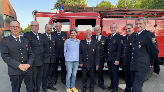 Timo Dirkorte (Löschzugführer Löschzug Harsewinkel), Alfons Hennemann (Löschzugführer Löschzug Greffen), Julian Austermann (angehender stellvertretender Leiter der Freiwilligen Feuerwehr Harsewinkel), Udo Huchtmann (stellvertretende Kreisbrandmeister), Sabine Amsbeck-Dopheide (Bürgermeisterin), Dietmar Fölling, Uwe Theismann (stellvertretender Kreisbrandmeister), Christoph Wienströer (Leiter Feuerwehr Harsewinkel), Andre Hackfort (Jugendwart Jugendfeuerwehr Harsewinkel) und Günter Austermann ( Löschzugführer Löschzug Marienfeld und angehender stellvertretender Leiter der Freiwilligen Feuerwehr Harsewinkel) (Foto: Gabriele Grund).