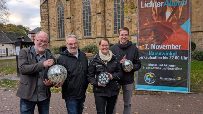 Gute Stimmung bei den Vorbereitungen zum 17. LichterAbend in Harsewinkel: (v. l.) Reinhold Everding, Chris Brentrup (beide Werbegemeinschaft Harsewinkel e.V.), Simone Heitmann (HVMC) und Robin Ossenbrink (Stadtverwaltung).