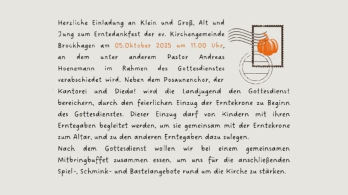 Der Erntedankgottesdienst in der St.-Georgkirche in Brockhagen beginnt um 11 Uhr. In diesem Gottesdienst wird Pfr. Hoenemann verabschiedet, der in Oberholzklau (Siegerland) seine erste gewählte Pfarrstelle antreten wird. Der Gottesdienst wird musikalisch von der Kantorei, dem Posaunenchor und dem Chor „Dieda!“ gestaltet. Die Landjugend wird am Anfang die Erntekrone in die Kirche tragen. Im Anschluss an den Gottesdienst sind alle zum Gemeindefest eingeladen.