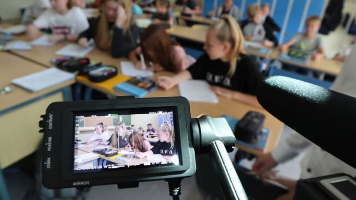 Ein Foto von den Dreh-Arbeiten zu den Erklär-Videos aus dem vergangenen Jahr. Die Filmcrew hat die Peter-August-Böckstiegel-Gesamtschule in Borgholzhausen in ein Filmset verwandelt und die Schülerinnen und Schüler der 8. Klasse schlüpften in die Rolle von Schauspielern und Komparsen.