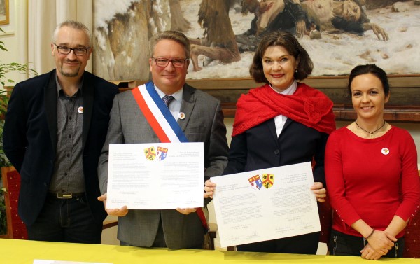 Doch bevor es auf das Herbstfest auf dem Platz Saint Sauveur am Ufer der Seine ging, stand am Samstagmorgen die offizielle Feier im Rathaus auf dem Programm. Frédéric Duché, Bürgermeister der Seinestadt, stellte in seiner Rede vor rund 100 Besuchern im Hochzeitssaal die besondere Verbindung zwischen Frankreich und Deutschland im Allgemeinen und die zwischen Les Andelys und Harsewinkel im Besonderen heraus. Für die Zukunft formulierte er den Wunsch, noch mehr Menschen für die Städtepartnerschaft zu begeistern. Dabei soll ein besonderer Fokus auf den jungen Menschen liegen. Sie sollen „als Botschafter für unsere Städte werben, damit die Partnerstadt auf den Spuren fortgeführt wird, die unsere älteren Mitbürger hinterlassen haben.“ Auch für Bürgermeisterin Sabine Amsbeck-Dopheide spielen die besonderen Beziehungen zwischen Frankreich und Deutschland innerhalb der EU sowie die Einbeziehung der jungen Generation eine zentrale Rolle: So betonte sie in ihrer Ansprache, dass „die Regierungen Frankreichs und Deutschlands vorangehen müssen, um für und mit der Jugend Europas die Föderation der Vereinigten Staaten von Europa Wirklichkeit werden zu lassen.“ Dabei sollten sich die nationalen Regierungen von den funktionierenden Städtepartnerschaften ermutigen lassen. Dass die Jugendarbeit im Harsewinkeler Partnerschaftsverein großgeschrieben wird, wurde bei der Rede von Mary Brüggemann deutlich. Brüggemann, die im Juli 2018 in der Nachfolge von Günter Rauh zur Vorsitzenden des Vereins gewählt worden war, wies auf die bereits seit vielen Jahren bestehenden Jugendprojekte und den regelmäßig stattfindenden Schüleraustausch hin. Für die Zukunft wünschte sie sich mehr Zeit für einen noch intensiveren Austausch, um unter anderem tiefer in die Kultur des jeweils anderen Landes eintauchen zu können. Nicolas Larcher verwies als Vorsitzender des französischen Partnerschaftskomitees auf die vielen gemeinsamen Erlebnisse und Erinnerungen, und versprach, alle Anstrengungen zu unternehmen, um zu erhalten, was von den Vorgängern geschaffen worden sei. Bürgermeisterin Sabine Amsbeck-Dopheide überreichte anschließend das Gastgeschenk, zu dem neben den 25 Hopfenpflanzen aus dem Marienfelder Klostergarten auch einige Flaschen des Marienfelder Klosterbräus sowie Harsewinkeler Pferdeäpfel gehörten. Aus den Händen ihres französischen Amtskollegen nahm sie unter anderem ein Foto des Château Gaillard, dem Wahrzeichen von Les Andelys, entgegen. Bei der anschließenden Unterzeichnung der Partnerschaftsurkunde wurde das gegenseitige Versprechen, den europäischen Gedanken im Rahmen der Städtepartnerschaft zu fördern und zu entwickeln, erneuert.