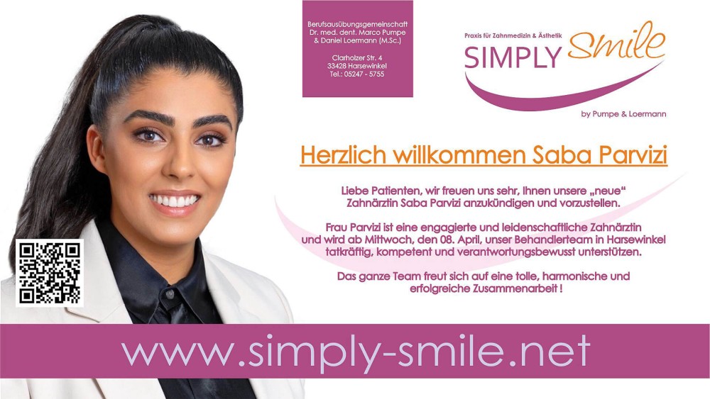 Frau Parvizi ist eine engagierte und leidenschaftliche Zahnärztin und wird ab Mittwoch, den 8. April, unser SIMPLY Smile Behandlerteam hier in Harsewinkel tatkräftig, kompetent und verantwortungsvoll unterstützen.