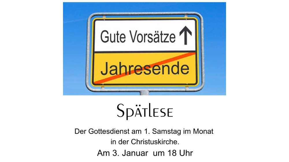 2026 möchte dabei eine Hilfestellung sein, um nicht an den eigenen Ansprüchen zu zerbrechen und sich selber nicht als ein Projekt der Perfektionierung zu sehen. Stattdessen Kraft finden für Veränderungen in dem Aufspüren des richtigen Maßes für einen selbst. Der „Spätlese-Gottesdienst“ ist ein alternatives Gottesdienstformat, das generationsübergreifend ausgerichtet ist: Die Woche ausklingen lassen, entschleunigen, sich besinnen und Besinnung erfahren. Im Anschluss sind alle zu einem (Spätlese-)Umtrunk und einem kleinen Imbiß eingeladen.
