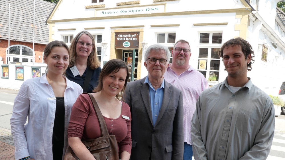 Ebenfalls mit von der Partie war der frühere Harsewinkeler Stadtarchivar Eckhard Möller, der viele Jahre zur Geschichte der jüdischen Familien geforscht hat und einen freundschaftlichen Schriftverkehr mit dem Großvater des Besuchers pflegt. „Paul Mendels besuchte Harsewinkel zuletzt 2009 gemeinsam mit seiner Enkelin Leora“, erinnert sich Eckhard Möller und freut sich, dass er nun den jüngsten Enkel von Paul Mendels kennenlernt. Er verrät: „Eine Ähnlichkeit zu den anderen Familienmitgliedern ist unverkennbar.“ Unterwegs hat der ehemalige Stadtarchivar einen spontanen Einfall und schlägt einen Besuch des einstigen Gasthofes Wilhalm vor. Dort hatten Käthe und Karl Mendels 1926 ihre Hochzeit gefeiert.