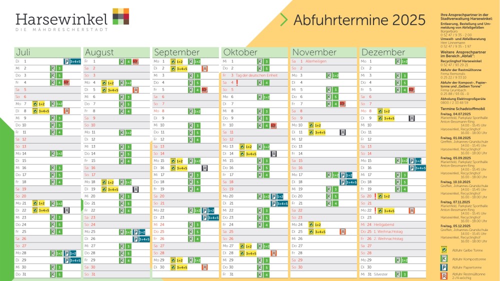 Die Leerung der Gelben Tonnen in den Bezirken 1+2 wird vorgezogen und findet bereits am Samstag, 20. Dezember 2025 statt. Die Abfuhr der Gelben Tonnen in den Bezirken 3+4+5 sowie die 2- und 4-wöchigen Leerung der Restmülltonnen wird am Montag, 22. Dezember 2025 stattfinden. Im neuen Jahr verschieben sich die Termine der Komposttonnenleerung in den Bezirken 4 und 5 aufgrund des Neujahrsfeiertags jeweils um einen Tag nach hinten.