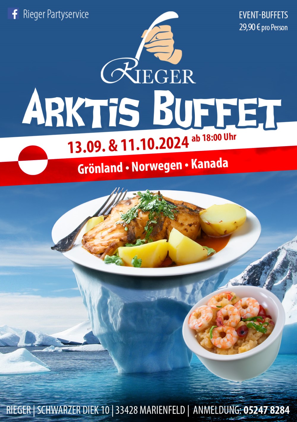 Wir bei Rieger freuen uns auf alle abenteuerlustigen Gäste am 13. September und 11.Oktober zu unserem Arktis-Buffet ab 18:00 Uhr für 29,90 Euro pro Person. Wir stoßen gerne eiskalt an bei einem Wodka. Anmeldungen unter 05247 8284.