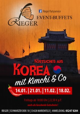 Unsere Themenbuffets unter dem Motto „Köstliches aus Korea“ finden freitags (14. Januar, 21. Januar, 11. Februar, 18. Februar), ab 18:00 Uhr statt. Der Preis beträgt 22,50 Euro pro Person. Die Event-Buffets servieren wir Ihnen auf Wunsch gerne auch im Catering-Service oder für besondere Feste und Gesellschaften in unseren Räumlichkeiten. Anfragen und Reservierungen nehmen wir gerne unter der Rufnummer 05247 – 8284 entgegen. Reservieren Sie jetzt Ihren Platz für unsere kulinarische Weltreise „An 80 Töpfen um die Welt“ und erleben Sie mit bei Rieger „Köstliches aus Korea“ – Checken Sie jetzt ein – wir freuen uns schon auf Sie!